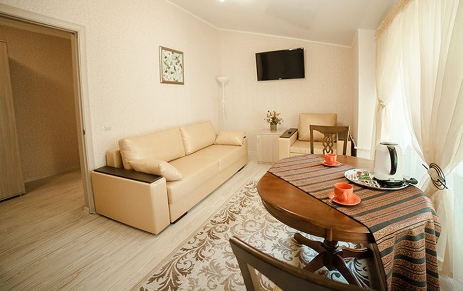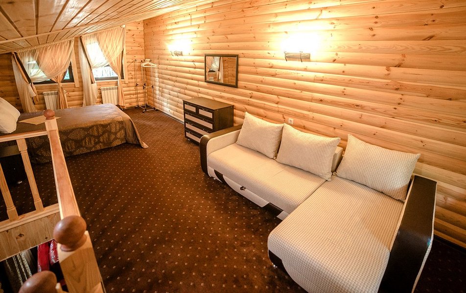 Все номера с удобствами, обеспечены необходимым набором мебели и техники. Есть телевизор, сейф, холодильник, фен, чайник; в номерах повышенной комфортности - халаты и тапочки. На полу – ковролин. Часть номеров с окнами в санузлах. Коттеджи рассчитаны на два номера с отдельными входами. Рядом – крытая беседка и мангальная зона. Внутри – гостиная с мини-кухней (без плиты), туалет на 1 этаже и спальня наверху.