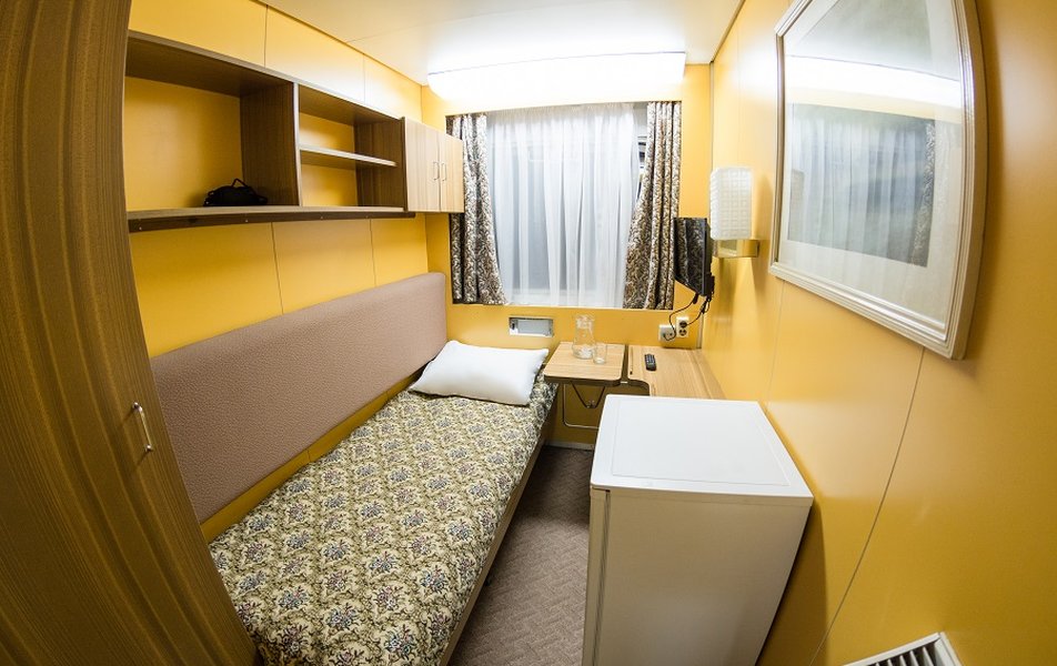 Одноместная каюта, расположенная на главной, средней и шлюпочной палубах со всеми удобствами (раковина, душ, туалет, кондиционер).