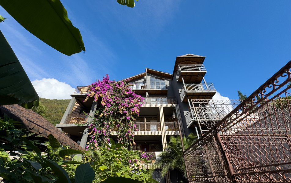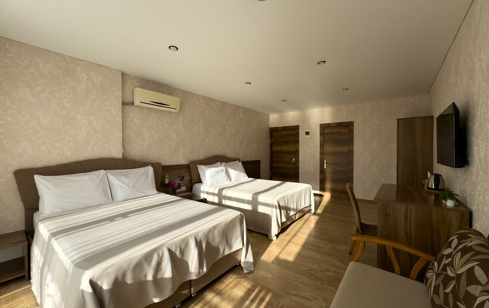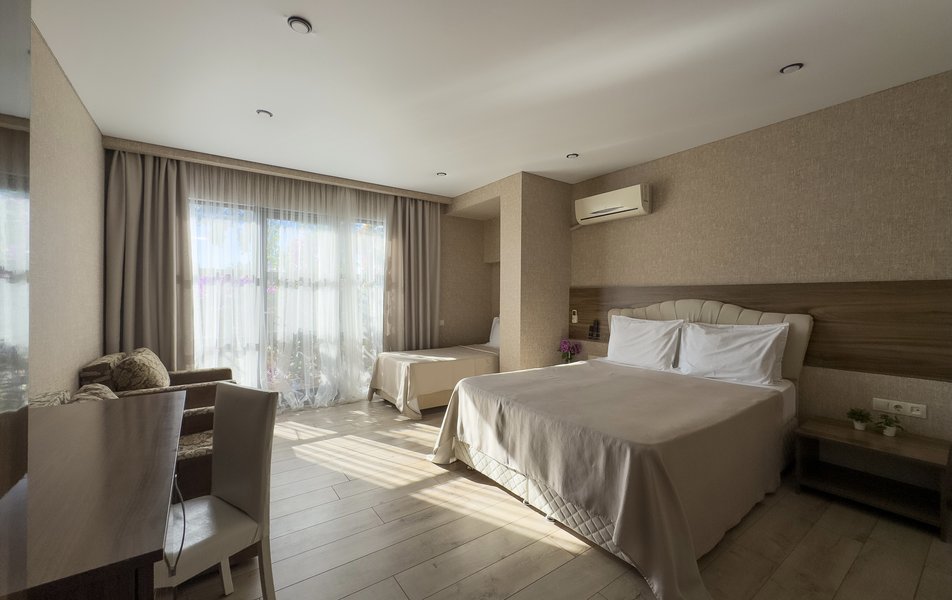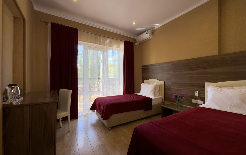 Четырехэтажный корпус отеля возвышается на собственной территории – скромной по размеру, но охраняемой и ухоженной. Здание окружают клумбы с кактусами и юккой, кипарисы, пальмы, лиственницы. Растения в сочетании с дыханием моря создают уникальный микроклимат. В жилом фонде гостиницы – стандартные номера с балконами и без них и просторные семейные номера. Интерьеры оформлены в приятных мягких тонах. В каждом номере – удобная мебель и бытовая техника: телевизоры, холодильники и кондиционеры.