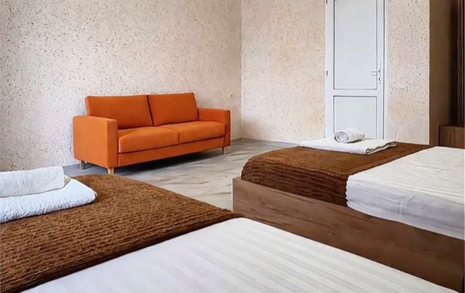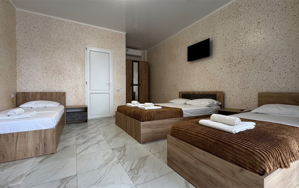 Для гостей подготовлены просторные двухместные, трехместные и четырехместные номера с продуманной планировкой. В каждом номере есть кондиционер, собственный санузел с феном, ежедневный набор полотенец и базовые гигиенические принадлежности. Из техники предусмотрен телевизор, а Wi-Fi работает на всей территории. В качестве приятного дополнения — стартовый набор с чаем, кофе и питьевой водой. Общая кухонная зона позволяет самостоятельно приготовить завтрак или легкий ужин, что особенно удобно при длительном размещении.