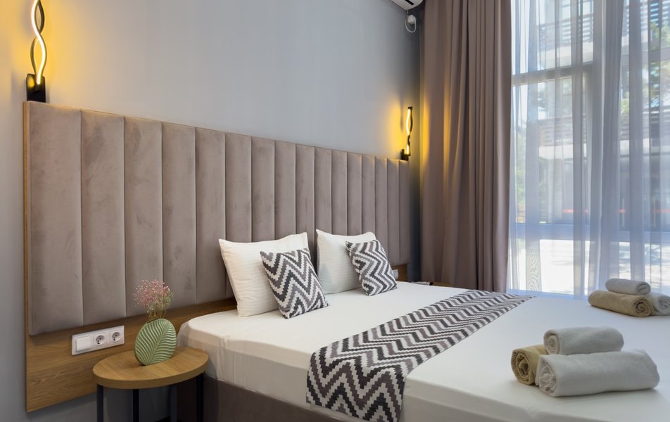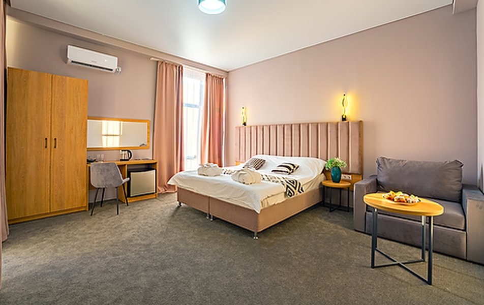 Уникальный 2-этажный отель в форме морского корабля располагает 28 номерами различных категорий с изысканным дизайном и сочетанием природных материалов. Текстильные изделия из натуральных тканей придают им тепло и уют. Панорамные окна с балкона открывают вид на море и горные пейзажи с восходом солнца и закатом. Во всех комнатах установлена удобная мебель, есть кондиционер, телевизор с плоским экраном, холодильник, электрический чайник. В индивидуальном санузле с душем - набор полотенец, туалетные принадлежности, тапочки и фен.