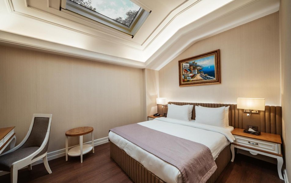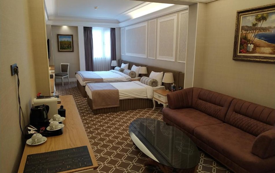 Трехэтажный корпус отеля разместился рядом с академическим театром имени Самеда Вургуна. Внутри — красивые интерьеры со сводчатые потолками и мраморными полами. Гостей ожидают современные номера разной категории комфорта. Отдыхающие могут выбрать как бюджетные номера без окна, так и остановиться в комнатах улучшенной категории. Во всех номерах независимо степени комфорта имеется индивидуальный санузел, кондиционер, плазменный телевизор и беспроводной интернет.