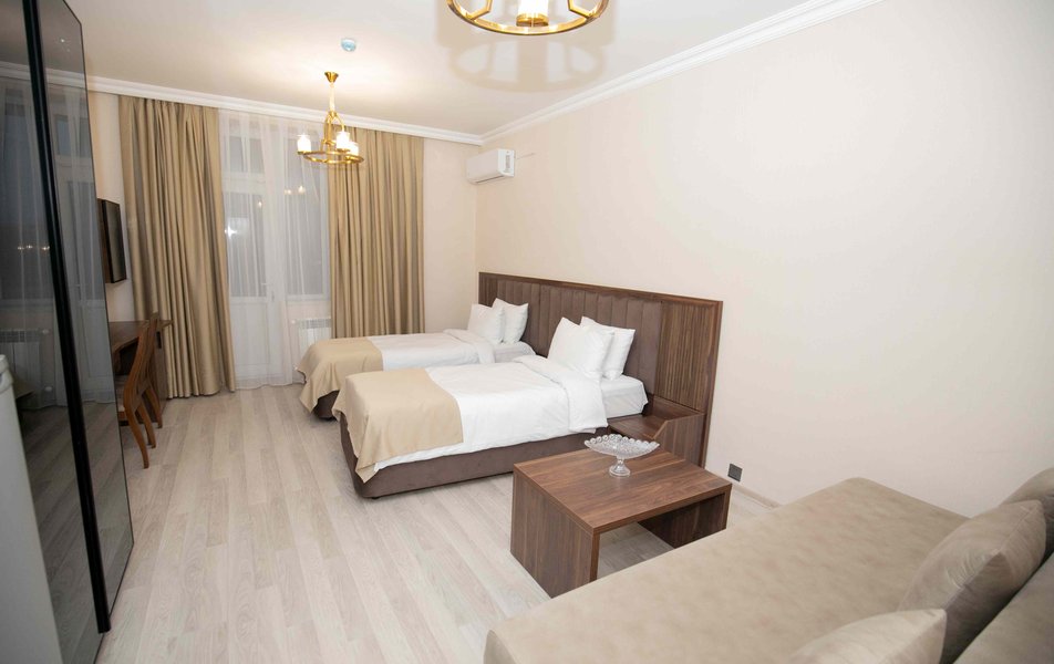 Поездом до ж/д вокзала г. Баку, далее на автобусе №Н1 до остановки «Баку Экспо Центр», далее на автобусе №150 до остановки «Бузовнинская подстанция», далее на автобусе №107 до остановки «Мечеть Стоп Али», далее пройти пешком 650 м до отеля.