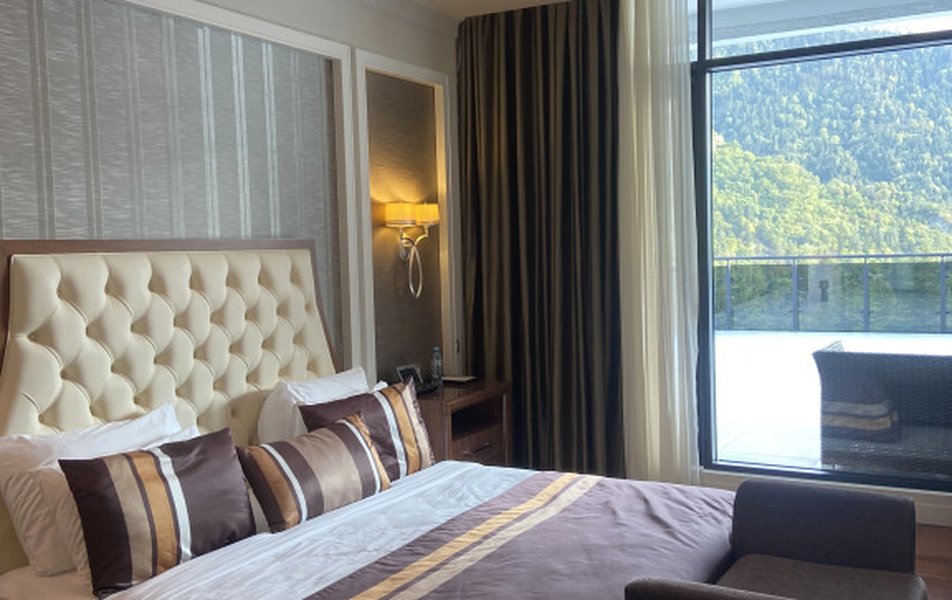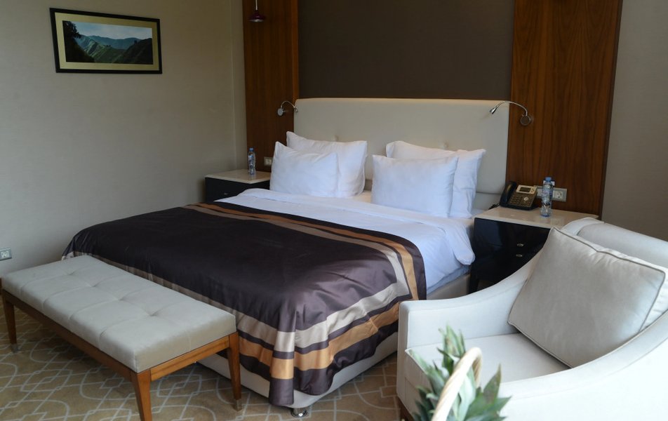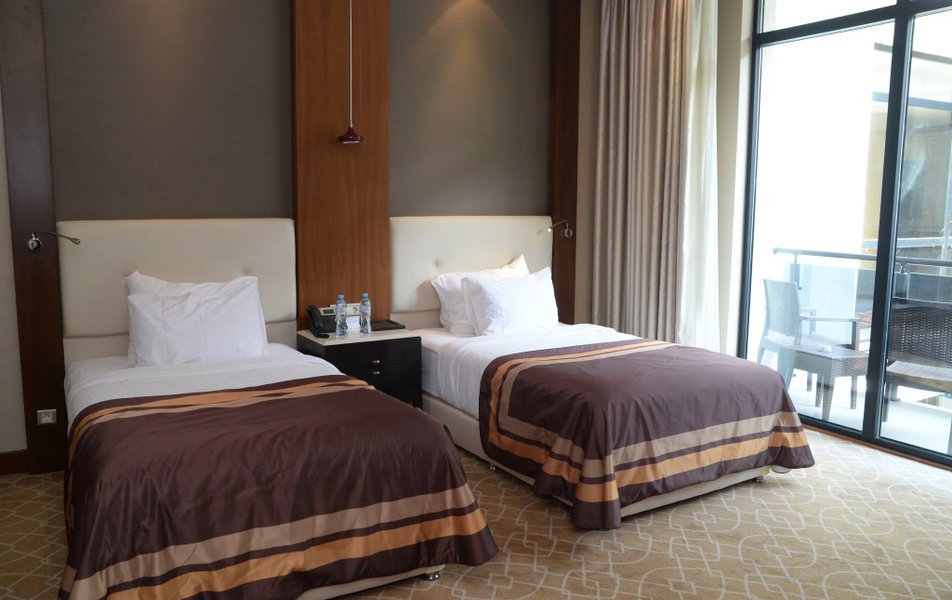 Семиэтажное здание отеля занимает территорию в парковой зоне недалеко от берега реки Кура. Жилой фонд включает более 150 номеров разных категорий комфорта. В каждом номере предусмотрен индивидуальный санузел с душем и косметическими принадлежностями для гостей. В комнатах – лаконичный интерьер, оформленный в приятных серо-коричневых оттенках, есть кондиционер, ЖК-телевизор, беспроводной интернет, электрочайник.