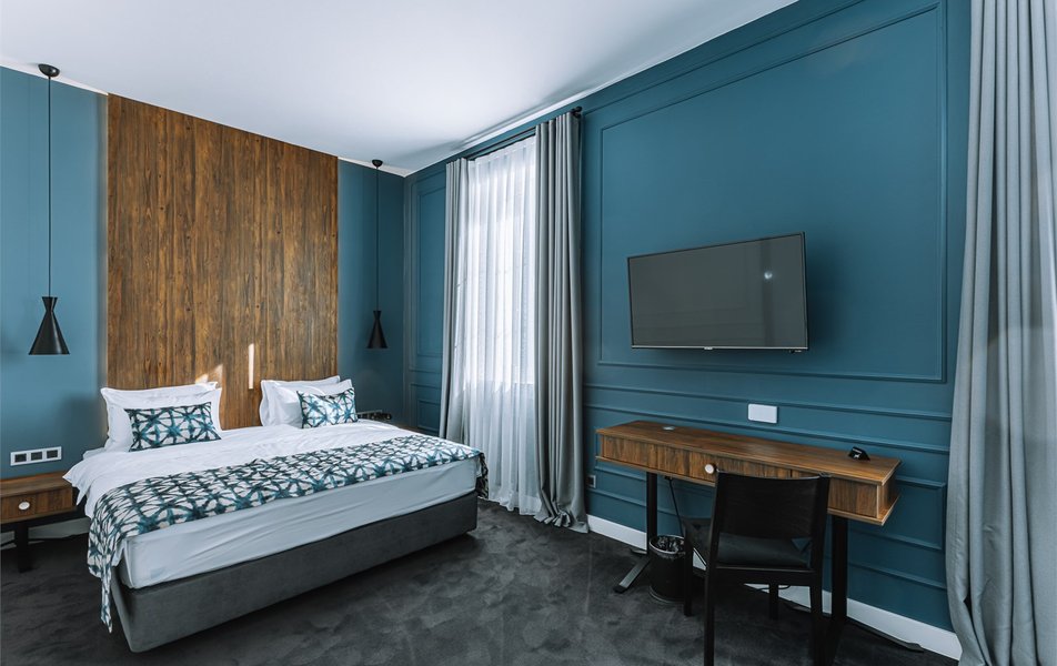 Гостей ждут стильные комнаты с современной техникой и удобной мебелью, а из окон открывается захватывающий вид на город.
