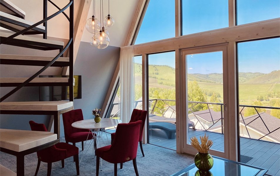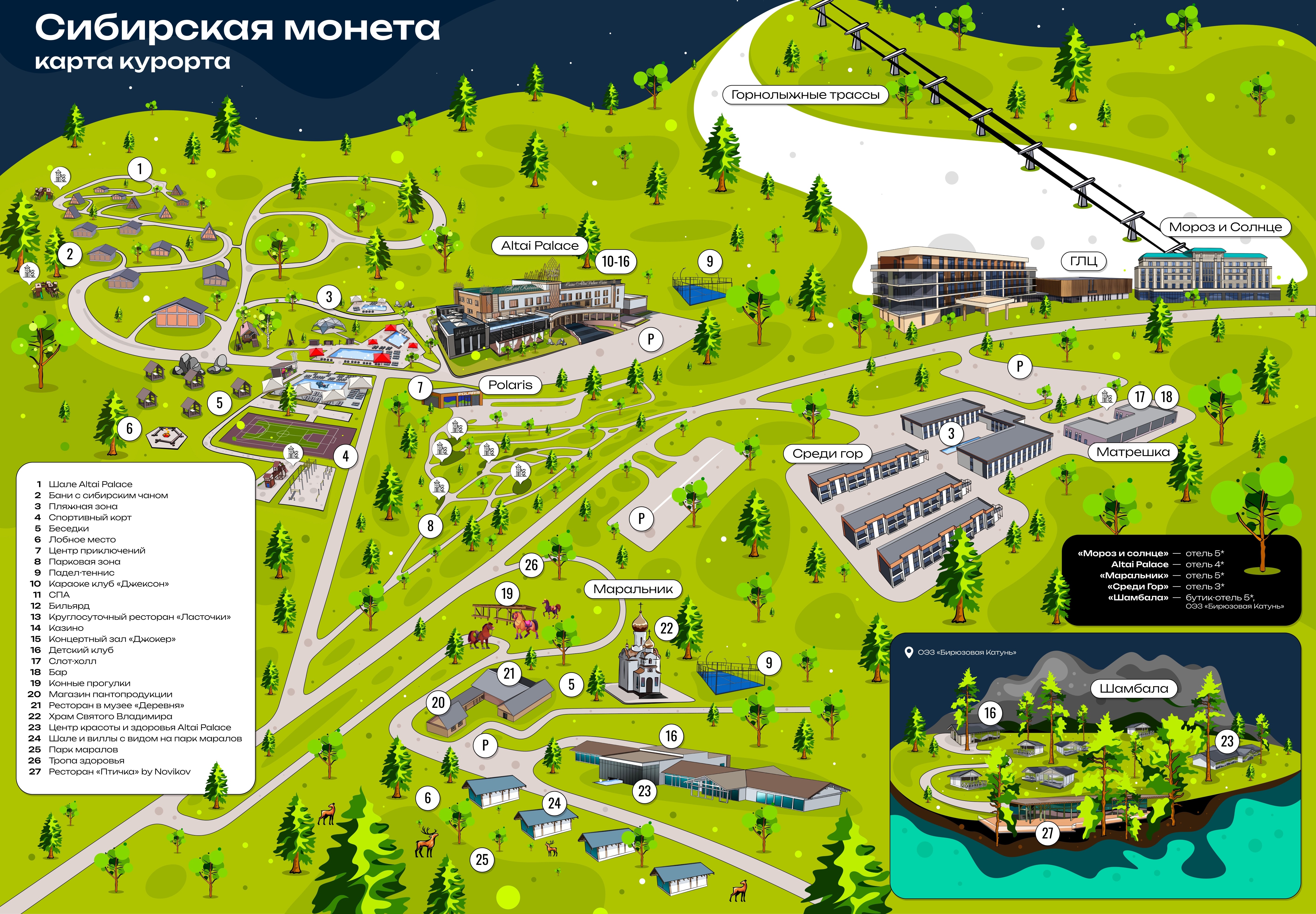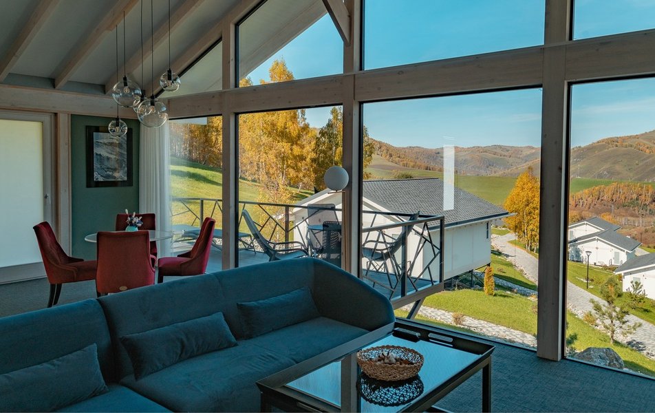 Территория сибирского Вегаса занимает открытое пространство в живописной долине за горой Каим, откуда открываются необыкновенные виды. Территория курорта включает в себя комплекс шале и вилл, а также один основной трехэтажный корпус 4*, оснащенный лифтом. Номера отличаются современным дизайном и продуманностью деталей. Гостям обеспечен максимальный комфорт – в номерах установлен телевизор, Wi-Fi, телефон, кондиционер, сейф, мини-холодильник, чайник, фен, халаты, тапочки, туалетные принадлежности. Проживание в трехкомнатных президентских люксах позволяет получить статус «Особого Гостя» с расширенным перечнем привилегий.
