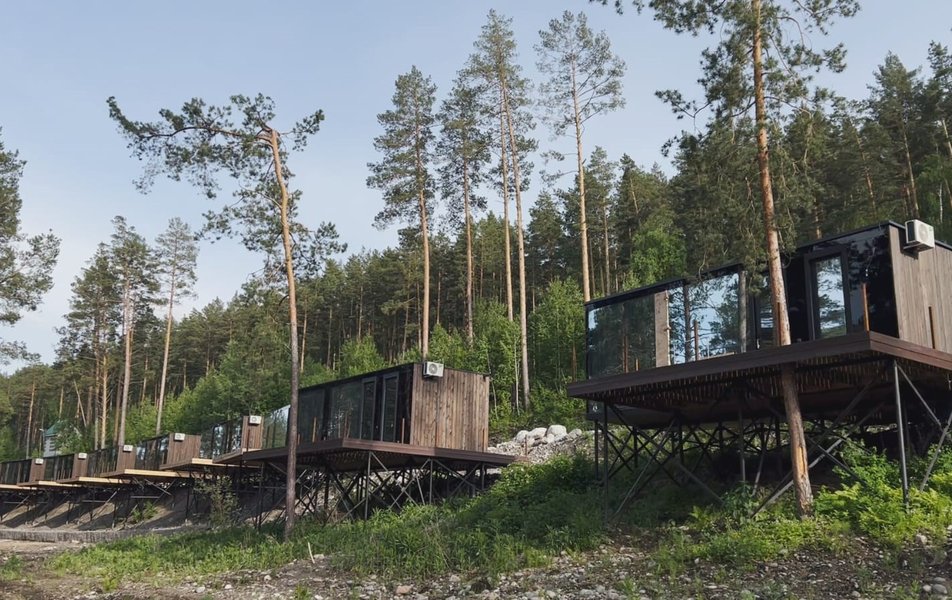 Отель занимает просторную территорию в окружении леса, на которой в две линии расположены современные модульные дома. Домики рассчитаны до 4 человека, внутри – система умный дом, теплые полы, панорамные окна, персональный санузел, кондиционер, кухонная зона. В числе удобств – фен, телевизор, наборы гигиенических принадлежностей, халаты. Возле каждого домика – терраса.