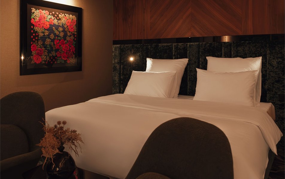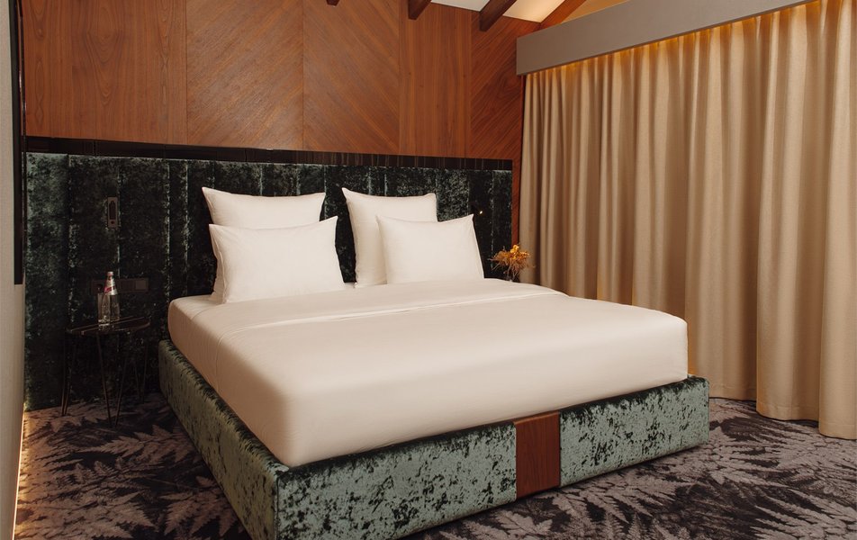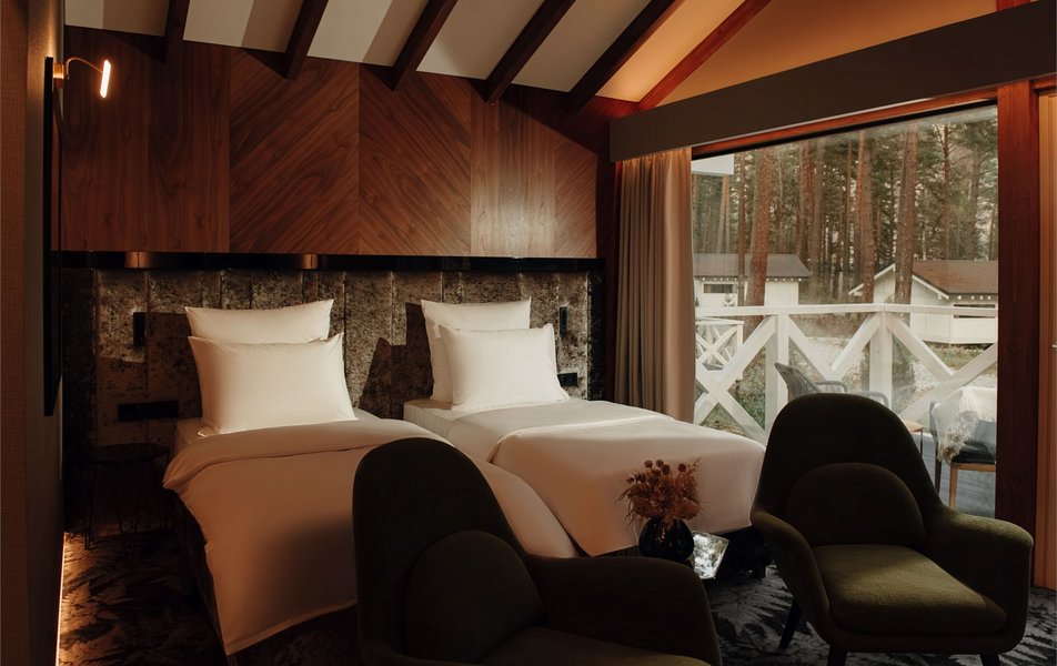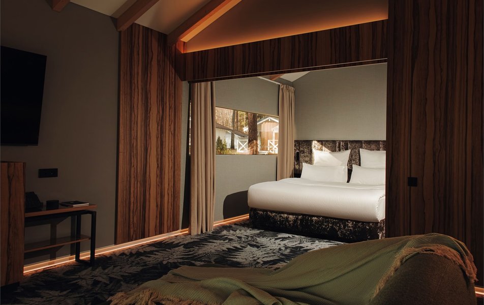 Отель представляет собой комплекс из 36 шале. Современный эко-дизайн каждого здания создает гармонию с окружающей природой, сохраняя атмосферу первозданности ландшафта. Интерьеры, созданные из натурального дерева, камня и прочих экологичных материалов, дополнены панорамными окнами, открывающими живописные виды. Номера оснащены удобными кроватями с ортопедическими матрасами, зоной отдыха с креслами, ЖК-телевизором, чайной и кофейной станцией. Персональный санузел оборудован душевой кабиной, теплым полом, феном, а гостям предоставляются предметы гигиены, халаты и тапочки.
