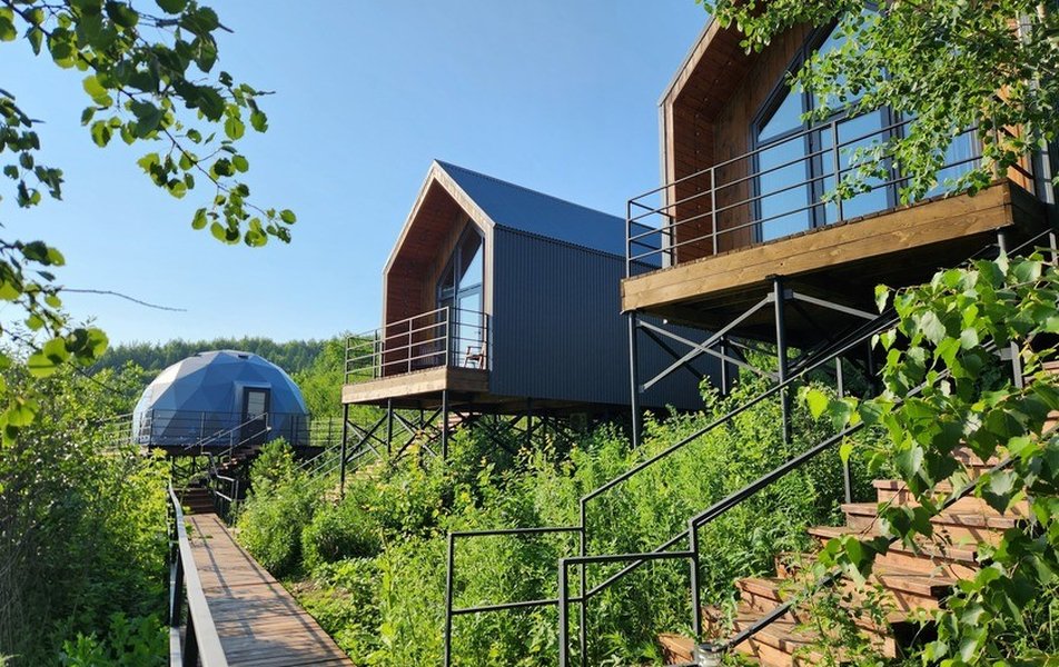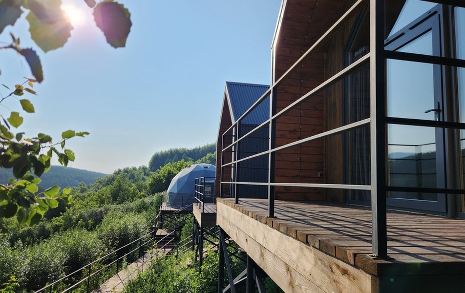 Ансамбль гостевого дома представлен оригинальными домами с панорамными окнами. Для проживания доступны два коттеджа в лофт-стиле с террасами, а также уютный геокупол с видом на гору Церковку. Все здания приспособлены для круглогодичного использования, оборудованы теплыми полами, отоплением и кондиционерами. Спальни оснащены широкой кроватью с ортопедическим матрасом и качественным бельем. В барнах оформлена зона отдыха с диваном и ТВ. Кухни укомплектованы посудой, необходимой бытовой техникой и базовым набором продуктов для завтрака (чай, кофе, крупы). Ванные комнаты с современными душевыми кабинами также оснащены туалетными принадлежностями и феном.