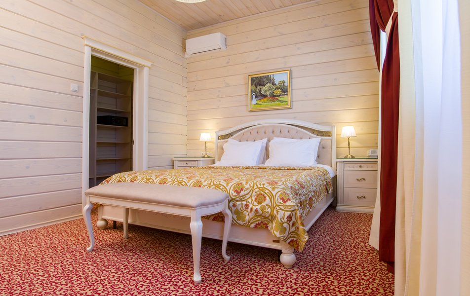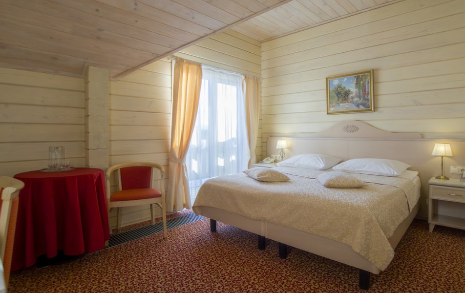 Корпус отеля представляет собой одно 2-этажное здание на 38 мест, выполненное в эко-стиле из соснового бруса. Обширная парковая территория занимает 5 гектаров. Она обустроена прогулочными дорожками, фонарями, лавочками, цветами. Для удобства отдыхающих оборудованы две открытые меблированные беседки с зоной барбекю и мангалом. К пляжу ведет деревянный пирс. Есть даже вертолетная площадка.