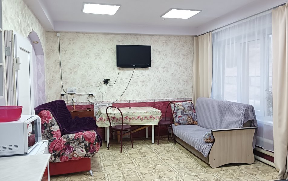 Номер-студия с отдельным входом разместился в доме на два номера. В спальне — односпальная и двуспальная модульная кровати, которые раздвигаются как две односпальные. В комнате также есть два дивана. Кухня укомплектована необходимой посудой и техникой - есть микроволновая печь, холодильник, индукционная плита. Для досуга и отдыха установлен телевизор с плоским экраном, доступен беспроводной интернет. Санузел персональный, оборудован душем.