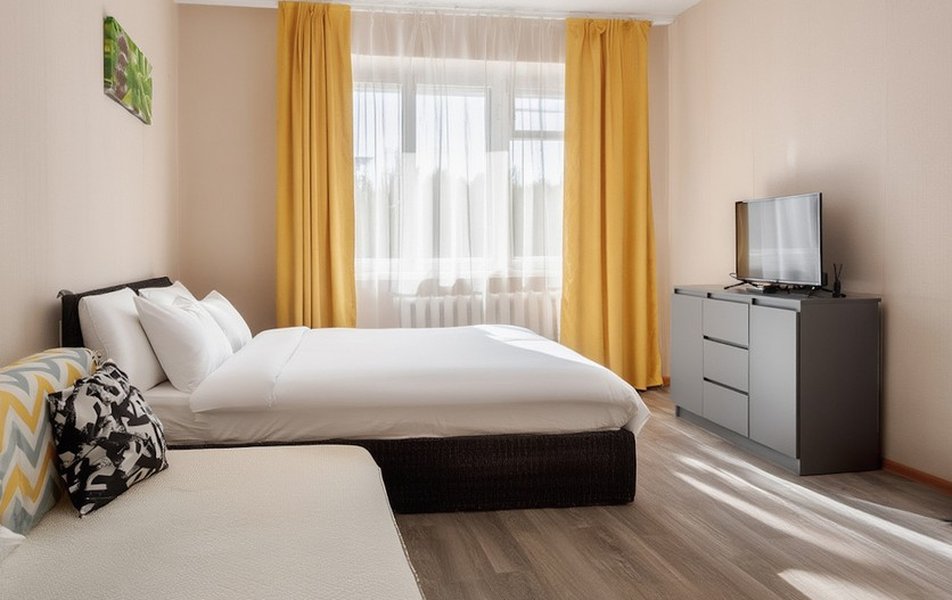 Однокомнатные апартаменты располагаются в 5-этажном жилом доме на третьем этаже. Просторная спальня оборудована двуспальной кроватью и дополнительным местом для отдыха в виде дивана. Прилегающая кухня полностью готова к использованию: в ней установлена вся необходимая техника, включая электроплиту с духовкой, микроволновую печь и полноразмерный холодильник, а также имеется базовый комплект кухонной утвари. В распоряжении гостей ЖК-телевизор и круглосуточный доступ к беспроводному интернету Wi-Fi. Санузел раздельный, с ванной, предусмотрены предметы гигиены и фен. Для повседневного ухода за одеждой имеется стиральная машина и гладильные принадлежности.