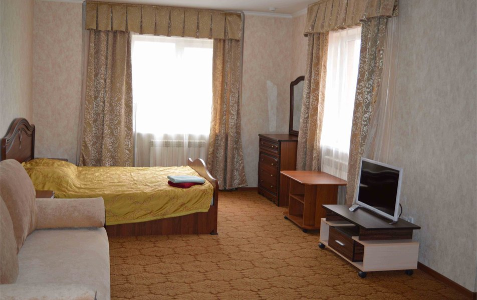 Современное трехэтажное здание отеля с четвертым мансардным этажом расположилось на обнесенном кирпичным забором участке площадью 5000 кв.м. Номерной фонд включает 115 номеров как категории Стандарт, так и Полулюкс и Люкс. Однокомнатные номера рассчитаны на размещение от одного до пяти человек, а вообще отель готов одновременно принять до 300 отдыхающих. Комнаты оснащены санузлом с душем или ванной, есть телевизор, холодильник, фен. При отеле работает столовая. кафе с русской и европейской кухней. Там гости могут приобрести себе завтрак, обед или ужин.