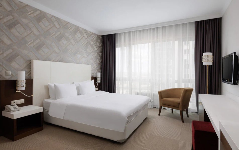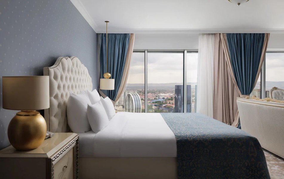Роскошный номер в приятных бежево-голубых тонах – единственный номер данной категории. Разделен на две комнаты: первая комната – гостиная с рабочей зоной, вторая комната – спальня с зоной отдыха. Из французских окон на всю стену открывается захватывающий вид на город.