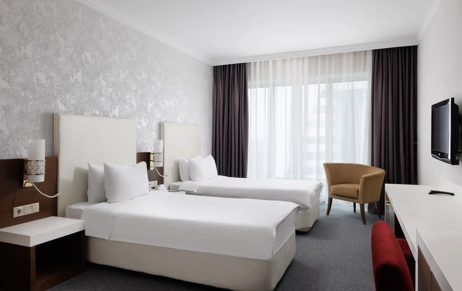 32-х этажное здание отеля, оснащенное современными лифтами, возвышается на берегу реки Сунжа. Обширный жилой фонд способен единовременно принять более 300 отдыхающих. Гостей ожидают элегантные и комфортабельные номера Стандарт, Люкс, Делюкс. В номерах классический интерьер, выдержанный в светлой цветовой гамме с добавление строгих алых оттенков. Все комнаты оснащены сплит-системой, санузлом с душевой кабиной и набором косметических принадлежностей. Для комфортного проживания есть вся необходимая техника — телевизор-ЖК, фен, электрочайник. В номерах повышенной комфортности в комната оборудована рабочая зона и гостиный уголок, а из окон отрываются живописные виды на Грозный.