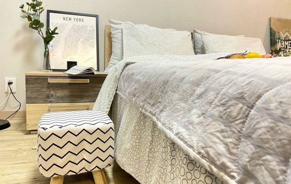 Бесконтактное заселение. Во всей сети «ПОДЕЛАМ» в Челябинск действует единый стандарт качества, а именно: белоснежное постельное белье из прачечной, профессиональный клининг, наличие необходимых в быту вещей, средства гигиены, посуда, техника, качественный сервис. В апартаментах двухспальная кровать, диван раскладной, кухня со всем необходимой посудой и техникой для самостоятельного приготовления пищи. Стиральная машина, фен, утюг, гладильная доска, сушилка для белья, Smart TV (онлайн-кинотеатры, YouTube) и высокоскоростной интернет Wi-Fi, вместительный шкаф туалетные принадлежности, стиральный порошок.
