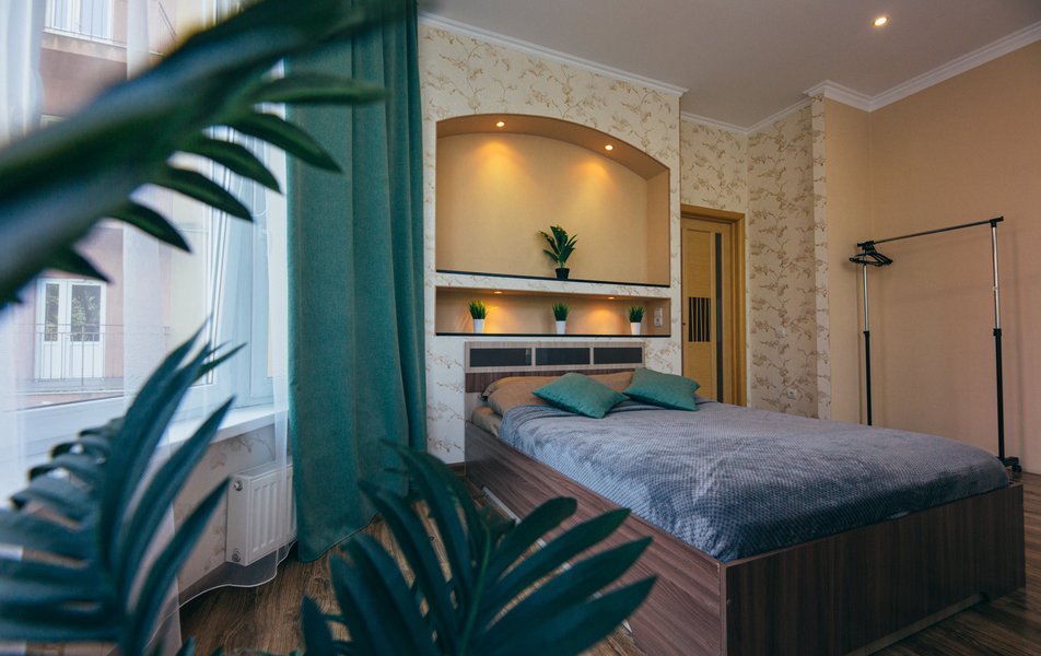 Просторное пространство площадью 84 квадратных метра рассчитано на размещение до шести человек и предлагает три полностью изолированных спальных места. В двух спальнях установлены удобные двуспальные кровати, а в гостиной — раскладной диван-еврокнижка. Для каждого гостя предусмотрено свежее постельное бельё, шесть подушек и три больших двуспальных одеяла. В каждой спальне есть плазменный телевизор с функциями Smart TV и федеральными каналами. Кухня полностью оборудована для приготовления еды: газовая плита, холодильник, микроволновая печь, электрочайник и полный комплект посуды на шесть персон. В ванной комнате — стиральная машина, фен, гладильная доска и утюг. На всей территории работает интернет Wi-Fi.