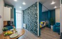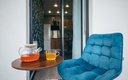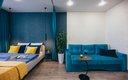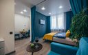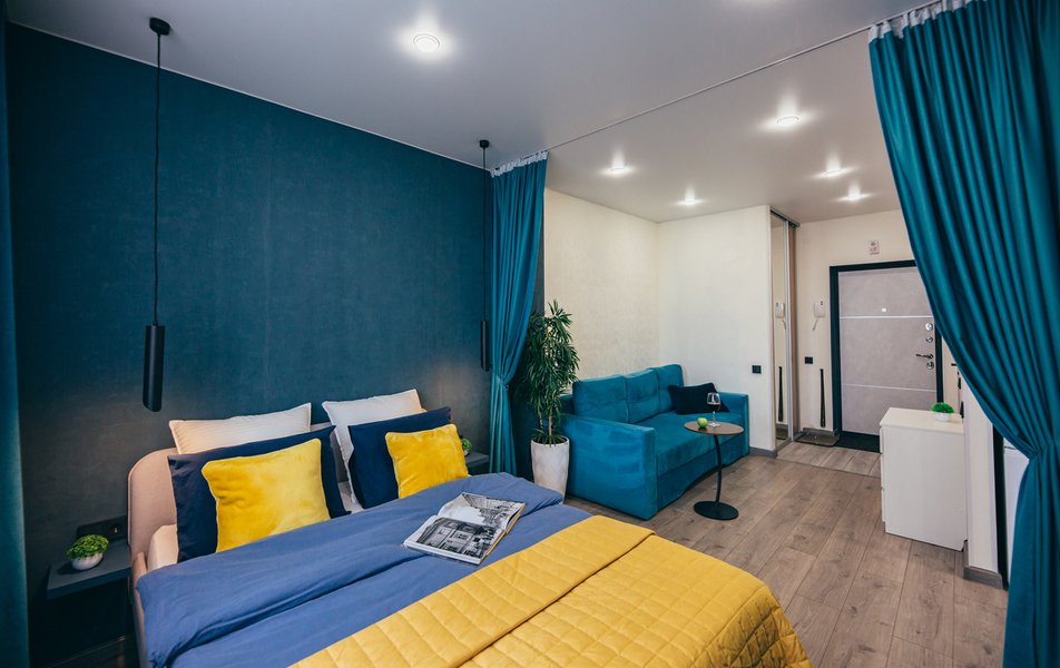 Внутри — полностью готовое к проживанию пространство для четырёх человек, включая гостей с детьми любого возраста. Для сна предусмотрены двуспальная кровать (160*200) с двумя большими подушками и двумя ортопедическими, а также два раздельных одеяла. Второе спальное место — раскладной диван (160*200), в кофре у которого гостей ждут дополнительные одеяла и постельное бельё. Кухня оснащена индукционной плитой, холодильником, микроволновой печью, электрокофеваркой, чайником и полным комплектом посуды на четыре персоны. В ванной комнате есть фен, а в распоряжении гостей также утюг и гладильная доска. К приятным мелочам можно отнести наличие стартовых наборов чая, кофе и средств гигиены, а также качественное постельное бельё и полотенца. В апартаментах работает высокоскоростной Wi-Fi от Ростелеком и Smart TV с федеральными каналами.