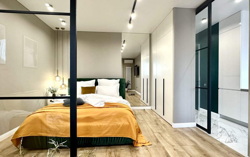 Стильные уютные апартаменты с современным дизайн-проектом разместились в новом жилом комплексе. Апартаменты оснащены кухней и индивидуальной ванной комнатой, есть все необходимое для комфортного отдыха – большая кровать, диван, плазменный телевизор. Мини-кухня оснащена посудой и бытовой техникой: есть посудомоечная машина, микроволновая печь, электрочайник, плита. В ванной комнате установлена стиральная машина, подготовлены косметические наборы для гостей. Среди услуг – высокоскоростной беспроводной интернет и бесконтактное круглосуточное заселение, которое позволяет гостям экономить время и приезжать в отель даже ночью.