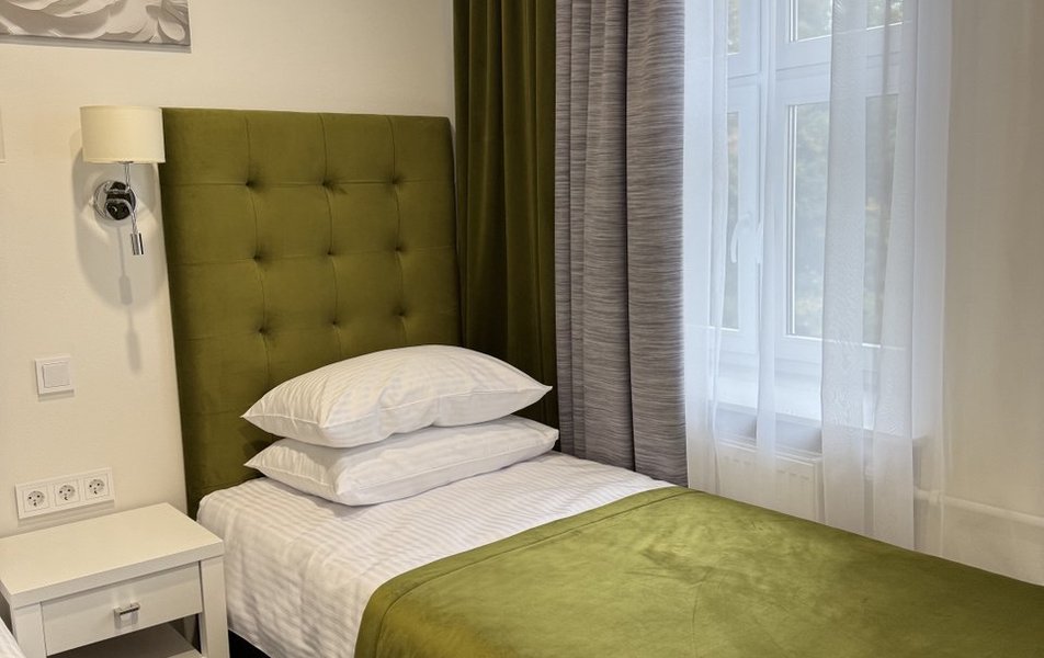 Четырехэтажное здание отеля с цокольным этажом предлагает отдыхающим 110 комфортабельных номеров категории Стандарт, Студия, Люкс, а также Апартаменты. В номерах, оснащенных санузлом с ванной или душем, есть все необходимое для хорошего отдыха.