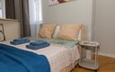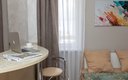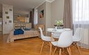 Просторная студия прекрасно подойдёт для двоих гостей, хотя при необходимости здесь комфортно разместятся до четырёх человек. В апартаментах установлена удобная кровать размера 160×200 сантиметров и мягкий диван-кровать, создающие атмосферу домашнего тепла и комфорта. Оснащённая современной техникой и красивой мебелью кухня готова предложить гостям всё необходимое для приготовления пищи и приятных семейных ужинов.
