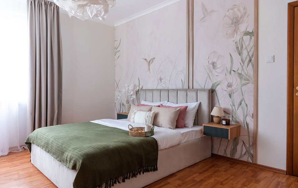 Внутри — две изолированные спальни, два санузла (один с ванной, второй с гигиеническим душем) и лоджия с креслом-качелью. Гостей разместятся на двух двуспальных кроватях 160×200 и удобном диване-книжке (до 6 человек). Кухня полностью оборудована: газовая плита, холодильник, микроволновка, фильтр для воды и посуда. Есть стиральная машина, фен, утюг с гладильной доской, сушилка для белья, два вентилятора, телевизор и Wi-Fi. Для работы предусмотрен отдельный стол.