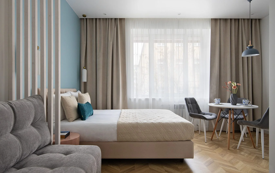 На тихой Гражданской улице, в самом сердце исторического Калининграда, находится студия «Лесной Лосось». Эти апартаменты — больше, чем просто место для ночлега; это творческое пространство, где смелые цветовые решения и авторские детали декора создают атмосферу, одновременно уютную и вдохновляющую. Светлое помещение, наполненное теплом, становится личным уголком в неспешном ритме старинного района.