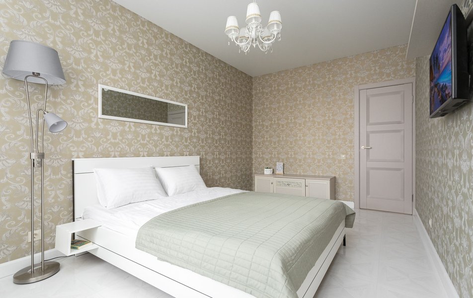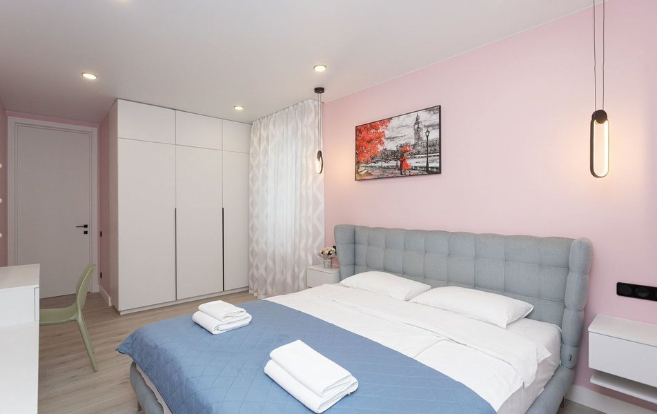 Апартаменты разместились в современном жилом комплексе, расположенном в парковой зоне. В распоряжении гостей 2-х комнатный дизайнерский номер со всеми удобствами. Апартаменты оснащены кухней, ванной комнатой, гардеробной, есть вся необходимая мебель и техника: двуспальная кровать, диван, обеденный стол, кондиционер, газовая плита, микроволновая печь, холодильник, электрочайник, обогреватель, телевизор ЖК, фен, гладильные принадлежности. Из окон открываются прекрасные виды на парк и Нижний пруд.