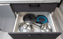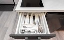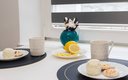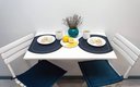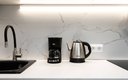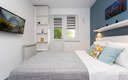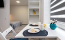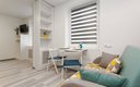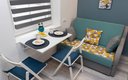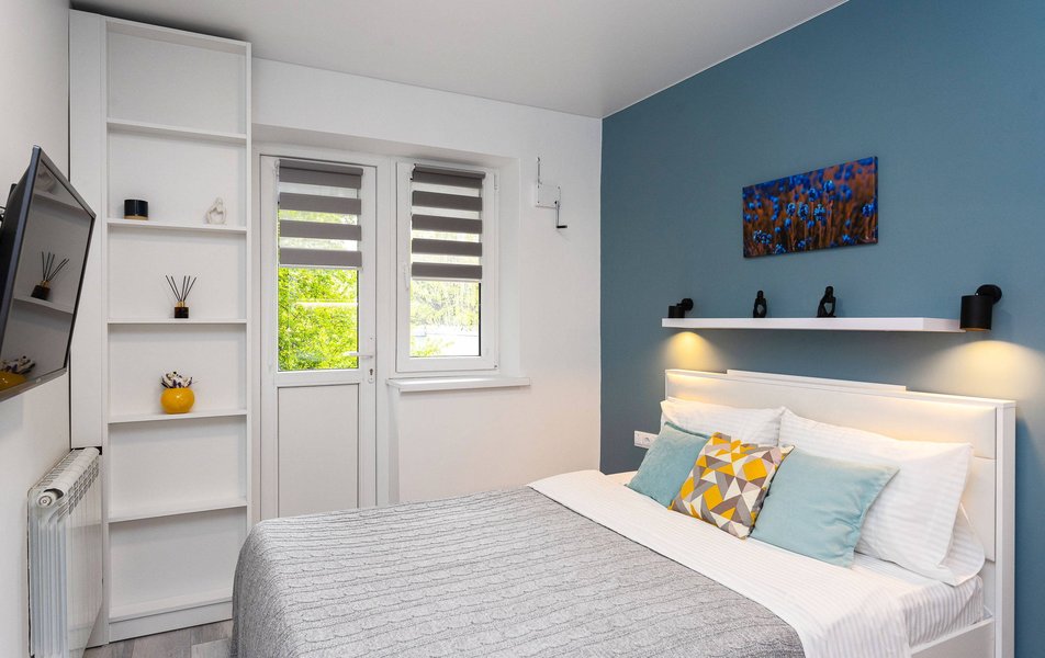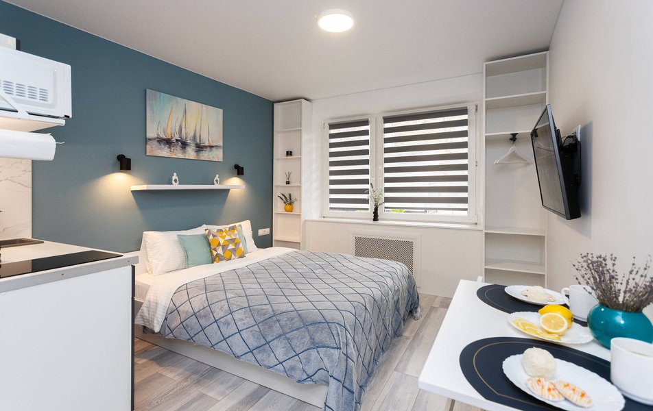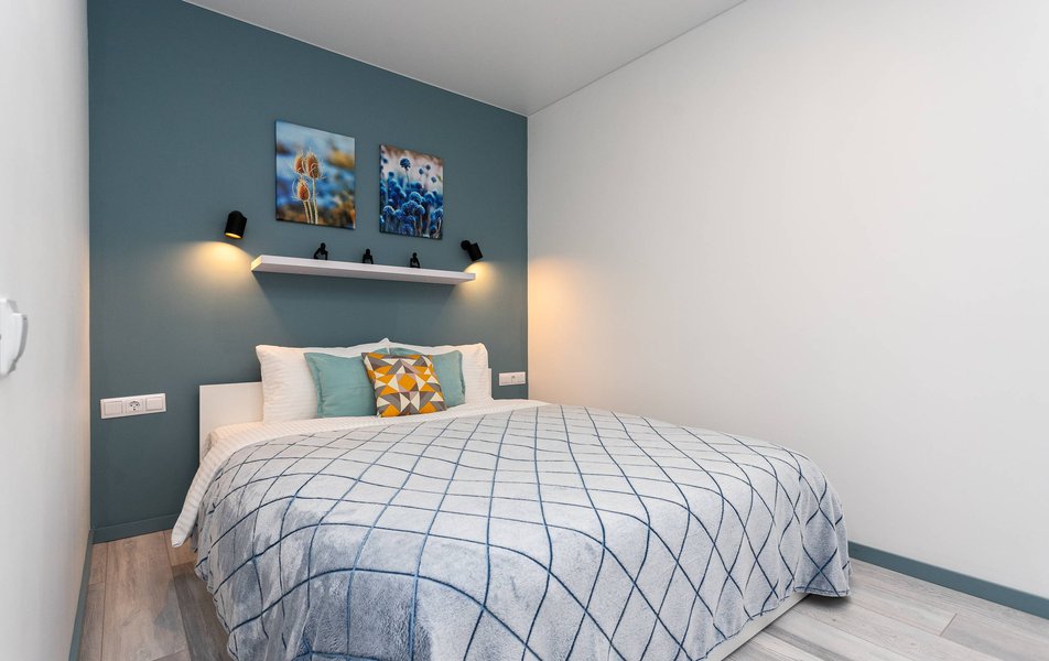 Внутреннее пространство грамотно организовано для отдыха четырех гостей. Предусмотрены двуспальная кровать шириной 160 сантиметров и компактный диван. В распоряжении гостей современная бытовая техника: варочная панель, мини-холодильник, СВЧ-печь, электрочайник, стиральная машина и всё необходимое для глажки. Кухонная зона полностью укомплектована посудой и принадлежностями для приготовления еды. В ванной комнате с душевой кабиной всегда есть горячая вода, а для комфорта предусмотрен фен. К приятным мелочам относятся свежее постельное белье, полотенца, тапочки, а также стартовый набор гигиенических средств, чай, кофе и сахар. В апартаментах работает бесплатный беспроводной интернет и есть телевизор с плоским экраном.