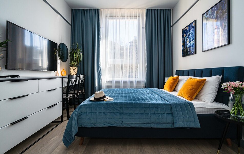 Интерьеры выполнены в современном стиле и продуманы до мелочей для комфортного размещения до пяти гостей. Формат пространства предполагает четкое зонирование: отдельная спальня с просторной кроватью 160×200 и удобным матрасом и просторная кухня-гостиная, где также расположено спальное место 160×200. Дополнительное спальное место представлено компактным креслом-кроватью. В распоряжении гостей полностью оснащенная кухня с посудомоечной и стиральной машинами, холодильником, микроволновой печью, электрическим чайником и кофеваркой. В ванной комнате — душевая кабина, фен и набор свежих полотенец с гигиеническими принадлежностями. Для поддержания комфортного микроклимата в кухне-гостиной установлен кондиционер, а автономное отопление позволяет регулировать температуру в любое время года. Из приятных деталей: смарт ТВ, высокоскоростной Wi-Fi, сушилка для белья и отпариватель. Окна выходят во двор, гарантируя тишину и спокойствие. Дом 2011 года постройки, вход в подъезд выполнен без ступенек, что удобно для гостей с багажом или колясками.