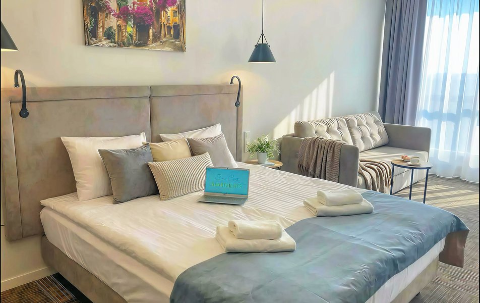 Апартаменты располагаются в жилом доме с лифтом. Дизайн апартаментов выполнен в современном стиле. В них имеется все необходимое для комфортабельного проживания: современная мебель для отдыха и хранения одежды, телевизор со спутниковым TV, кондиционер, телефон, гладильные принадлежности. Санузел с ванной, оснащен полотенцами и туалетными принадлежностями.
