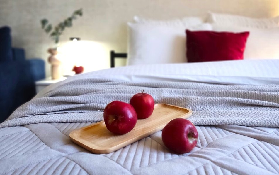 Внутри гостей ждёт продуманное пространство для жизни. В апартаментах установлена двуспальная кровать с качественным матрасом и удобный диван, который при необходимости становится дополнительным местом для сна. Кухня полностью оборудована для приготовления еды, а в санузле есть ванна, стиральная машина и фен. Для приятных мелочей тоже найдётся место: к заезду подготовлены свежее бельё и полотенца, а также стартовый набор гостеприимства — чай, кофе и средства гигиены. В распоряжении гостей высокоскоростной Wi-Fi и телевизор. Отдельная лоджия со столиком и стульями позволяет выпить утренний кофе с видом на город. Вход в дом расположен на уровне земли, без ступенек, поэтому заезжать с коляской или чемоданами очень легко.