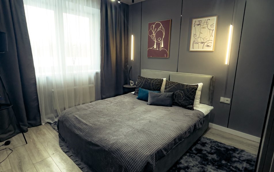 Внутреннее пространство оформлено в дизайнерском стиле и рассчитано на двоих гостей. Отдельная спальня оснащена двуспальной кроватью с ортопедическим матрасом и четырьмя подушками, вместительным шкафом-купе, торшером и телевизором со смарт-функциями. Плотные шторы блэкаут обеспечивают комфортный сон в светлое время суток. Кухня укомплектована встроенной техникой премиум-класса: индукционной плитой, духовым шкафом, посудомоечной и стиральной машинами, микроволновой печью, кофеваркой, скороваркой и холодильником, а также всеми необходимыми принадлежностями и стильной посудой для приготовления еды. Ванная комната с тёплым полом оборудована душевой кабиной, полотенцесушителем, феном и гигиенической косметикой. Гостям предоставляются постельные принадлежности и полотенца отельного качества с возможностью смены при длительном проживании, одноразовые тапочки и пляжный коврик. Для удобства предусмотрены гладильная доска, утюг и пылесос. На уютной лоджии с креслами и столиком приятно провести вечер за чашкой чая.