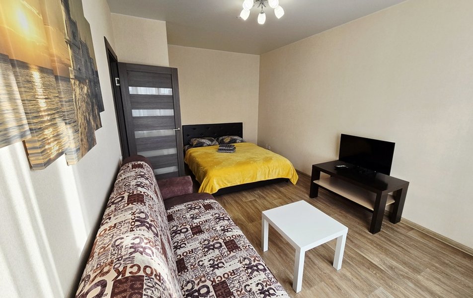 Просторные однокомнатные апартаменты рассчитаны на комфортное размещение трех человек. Интерьер выполнен в светлых тонах с использованием функциональной мебели и современной бытовой техники, создавая атмосферу домашнего уюта и порядка. Здесь есть всё необходимое для временного проживания, включая полностью оборудованную кухню, что позволяет гостям самостоятельно планировать свой рацион и распорядок дня.