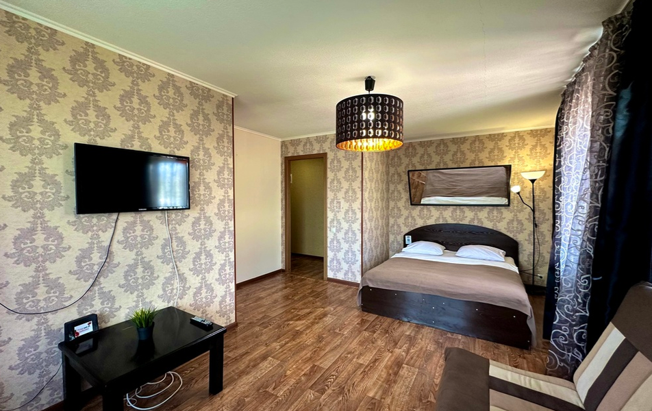 Внутри апартаментов предусмотрено комфортное проживание для компании до четырех человек. Для сна имеются двуспальная кровать и раскладной диван. К услугам гостей телевизор с широким выбором каналов и стабильный высокоскоростной интернет. Кухонная зона оборудована всем необходимым для самостоятельного приготовления пищи: плитой, холодильником, микроволновой печью, электрочайником и полным комплектом посуды. Для поддержания порядка и удобства проживающих установлена стиральная машина, имеется утюг с гладильной доской, бойлер, а также по запросу предоставляются вентилятор или обогреватель.