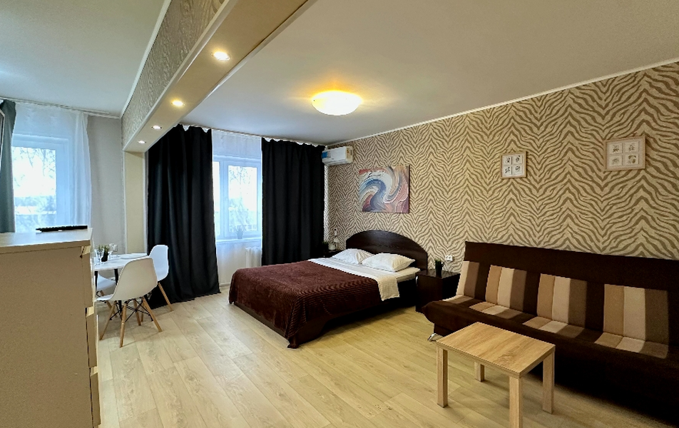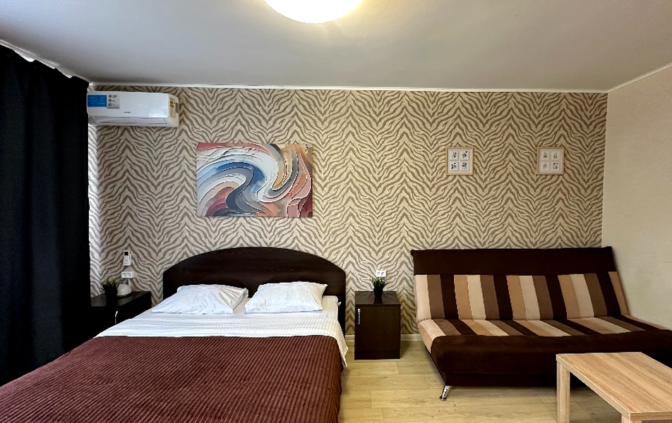 Пространство апартаментов спроектировано для комфортного проживания четырёх человек. Для сна имеются двуспальная кровать и раскладной диван. Гостям предоставляется доступ к телевизору с обширным выбором кабельных каналов и высокоскоростному интернету Wi-Fi. Кухонная зона полностью оборудована для самостоятельного приготовления пищи: имеется электрическая плита, холодильник, микроволновая печь, чайник и вся необходимая посуда. Для поддержания порядка и комфорта в квартире предусмотрены утюг с гладильной доской, а по запросу – вентилятор или обогреватель.