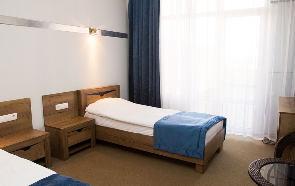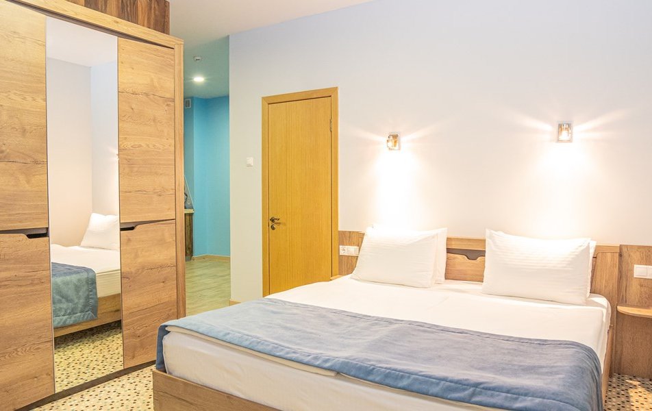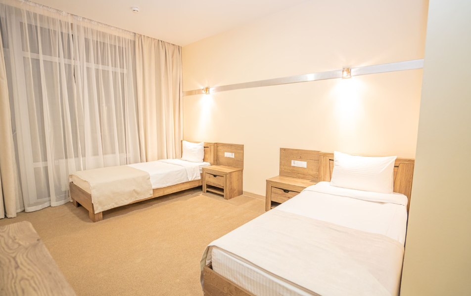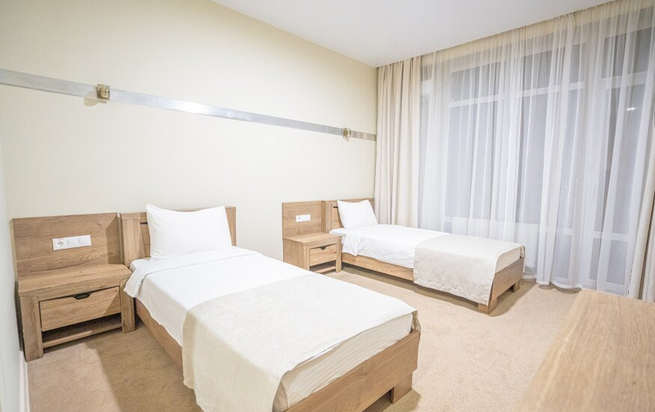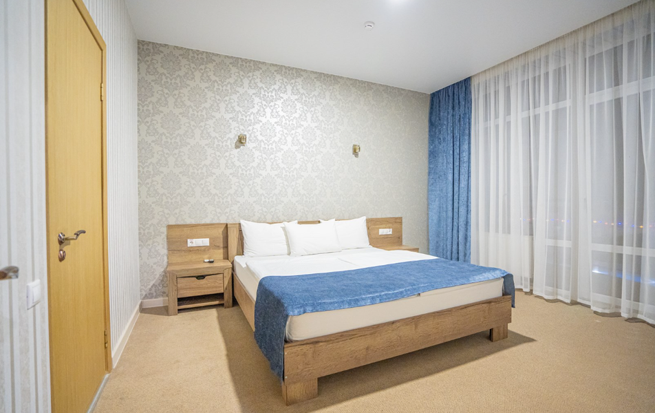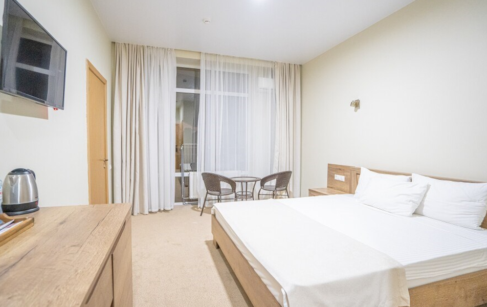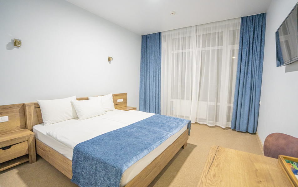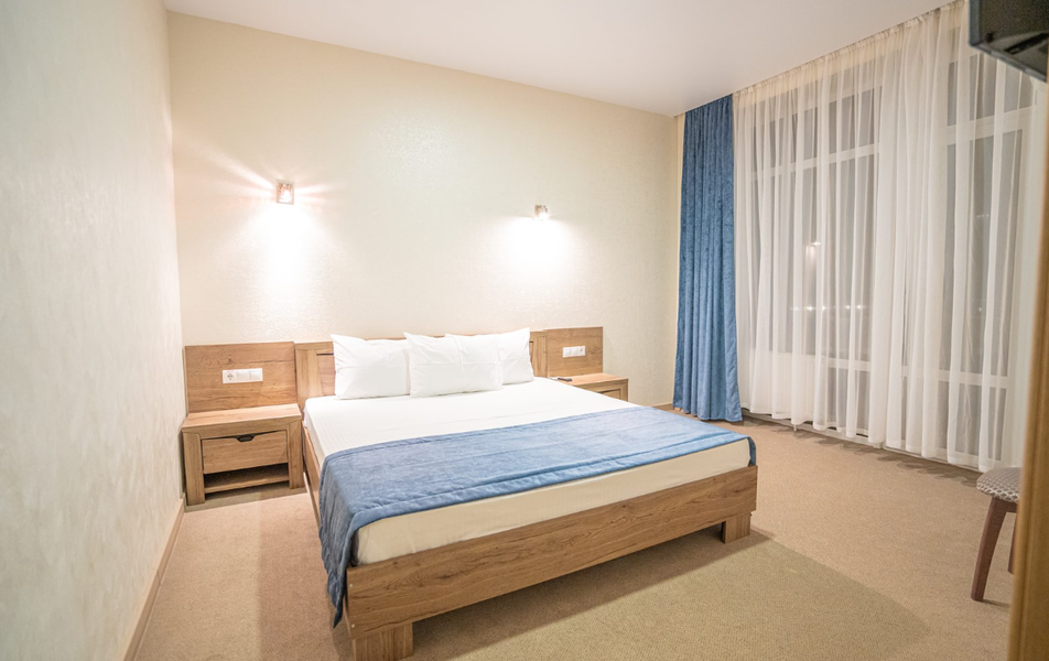 Четырехэтажный корпус отеля находится на закрытой благоустроенной территории и включает в себя 130 комфортабельных номеров категории Люкс, Стандарт и Джуниор Сьют. В комплектацию каждого номера входят сплит-системы, телевизоры, холодильники, набор посуды для чая, а в собственной ванной комнате – фен и косметические принадлежности.