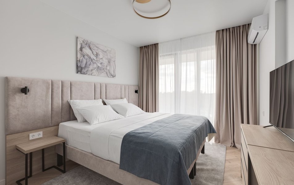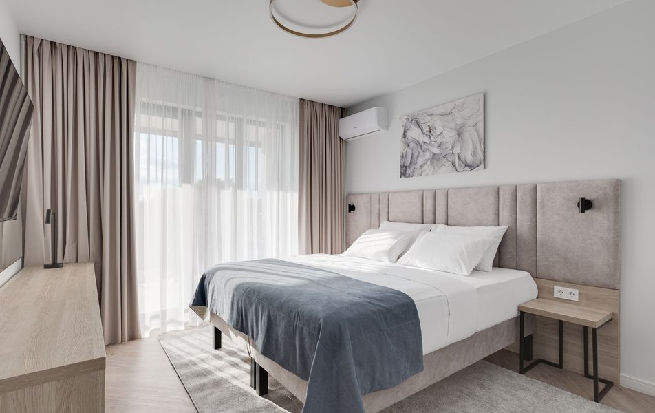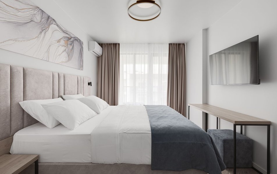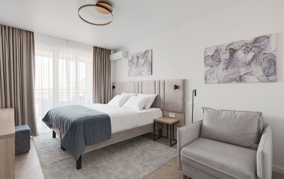 Варианты размещения продуманы для самых разных компаний. В отеле можно выбрать уютную «Студио» на двоих, трехместные «Апартаменты» или просторные 2-комнатные и 3-комнатные номера, вмещающие до 6 гостей. Также доступны улучшенные «Евро»-варианты аналогичной вместимости, где каждая семья или группа путешественников найдет идеальный баланс между личным пространством и общими зонами для отдыха.