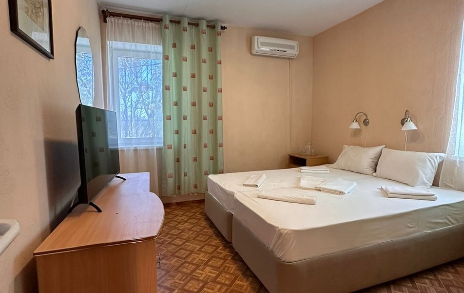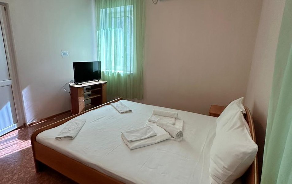 Пансионат занимает благоустроенную территорию в 100 метрах от моря, на которой возвышается шестиэтажный корпус, оснащенный современными лифтами, и отдельно стоящие коттеджи. Гостей ожидают номера разных категорий комфорта. В каждом номере установлен кондиционер, есть телевизор и мини-холодильник.