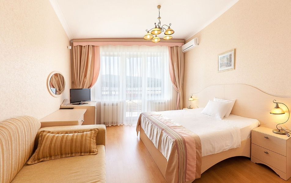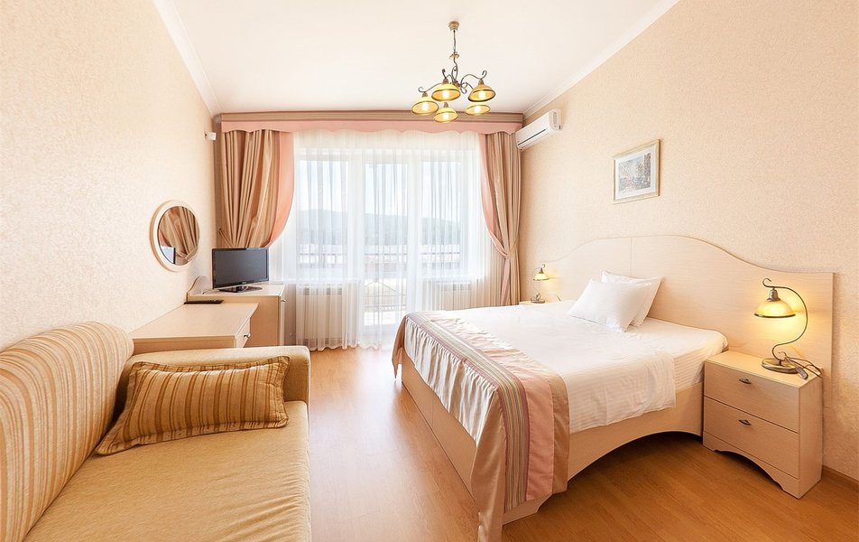 Четырехэтажное здание отеля расположено на закрытой территории площадью чуть больше полутора гектаров. Гостей ожидают 30 комфортабельных номеров со светлыми приятными интерьерами. В каждом номере предусмотрен собственный санузел с душем, установлена сплит-система, есть телевизор-ЖК и холодильник. В номерах улучшенной категории две комнаты, имеется гостиный уголок и дополнительная бытовая техника.