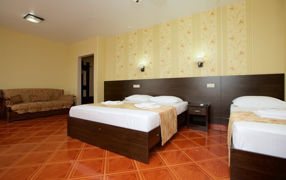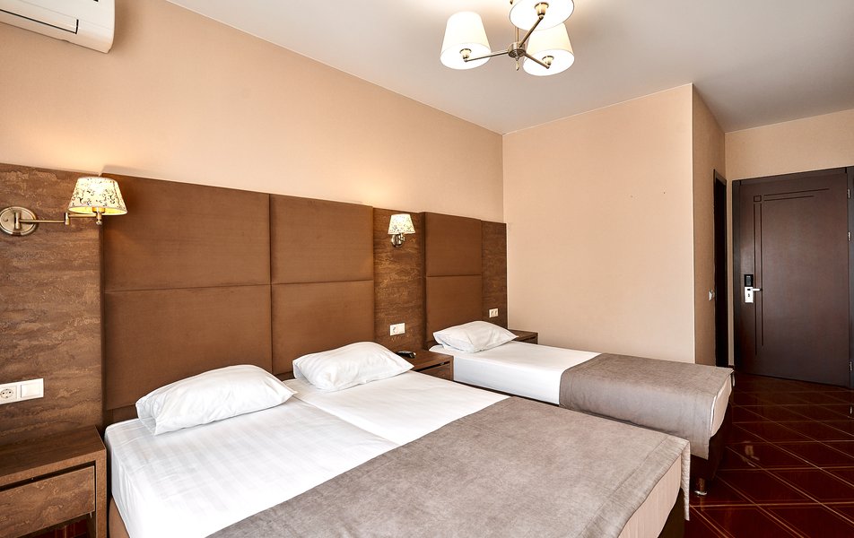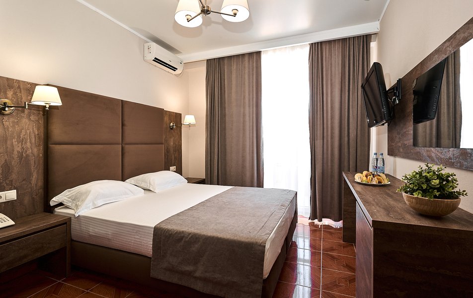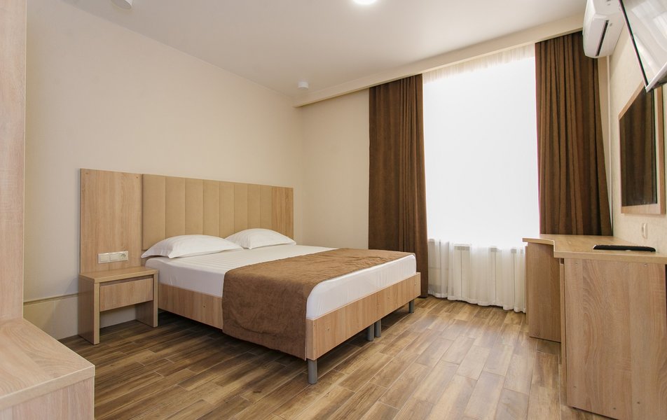 Семиэтажное здание отеля, оборудованное лифтом, стоит на собственной территории, благоустроенной и охраняемой. В его жилом фонде, способном одновременно принять на заселение не менее 220 человек, есть номера разных категорий от «люкса» до «стандарта». Каждый из этих просторных номеров, кроме расположенных на первом этаже, имеют меблированные балконы. В них всех есть автономный санузел с душем, обеспеченным туалетными принадлежностями и феном. Все номера имеют необходимый набор бытовой техники: сплит-систему, холодильник, телевизор и Wi-Fi.