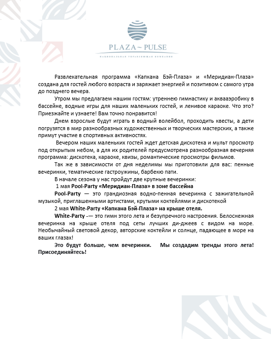 | Рестораны и бары | бар ресторан снэк-бар: с 10:00- 22:00; прохладительные напитки, чай, кофе; снеки, пицца, осетинские пироги, выпечка; с 12:00 — лёгкие алкогольные напитки (пиво, вино), коктейли («отвёртка», «северное сияние»), водка; с 15:00-16:00 — мягкое мороженое терраса: «Малибу» проходит шоу-кухня с представлением фирменного мастер-блюда от шеф-повара и дегустацией |