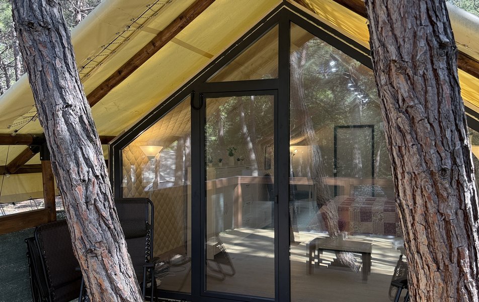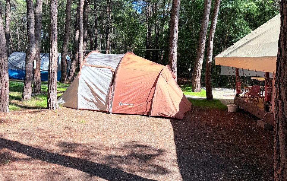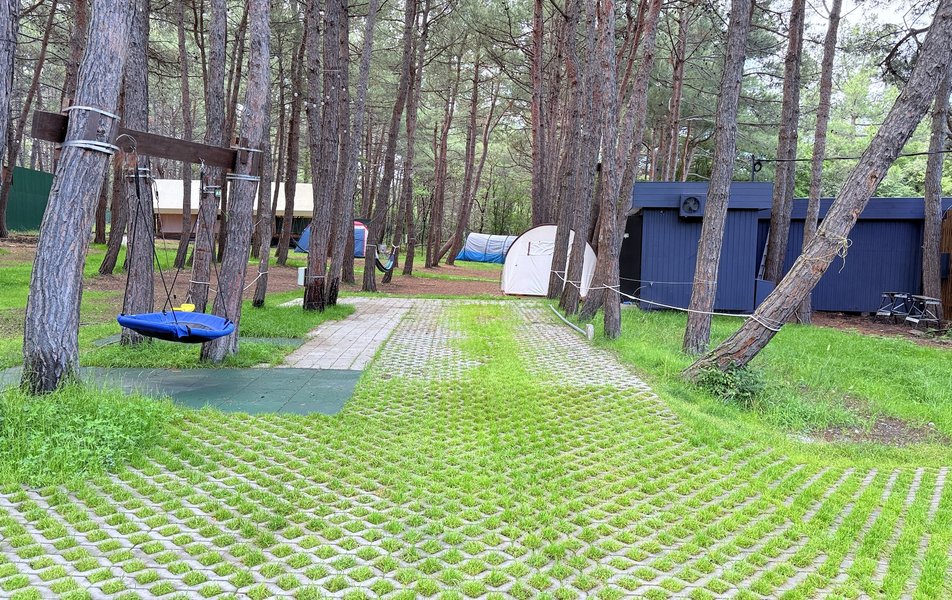 Комплектация места в кемпинге: место под палатку, персональная розетка прямо в палатку.