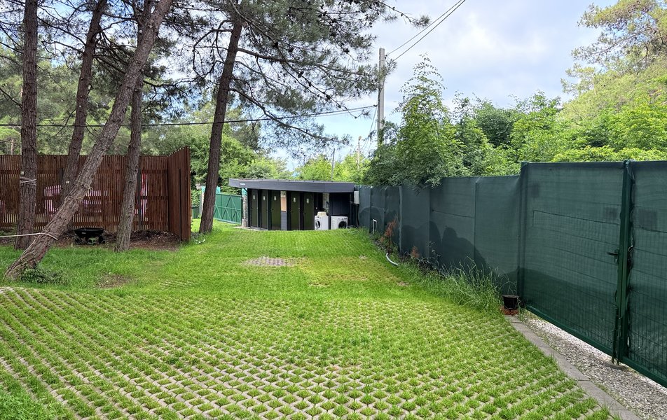Размер участка: 8*13м, отдельный въезд, в углу кемпинга, парковка на грунт. Есть место для маркизы. Вода и электричество подведены.