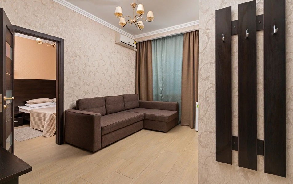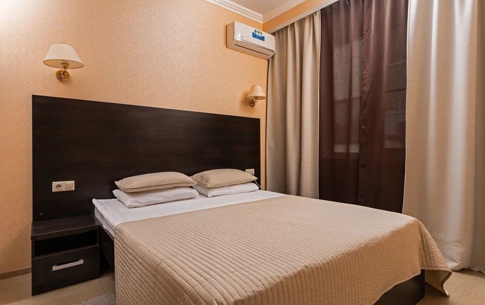 Здание отеля занимает благоустроенную закрытую территории с внутренним двором. В распоряжении гостей однокомнатные и двухкомнатные номера с удобствами. В каждом номере предусмотрен санузел с душем, есть кондиционер, электрочайник, набор чайной посуды, телевизор-ЖК.
