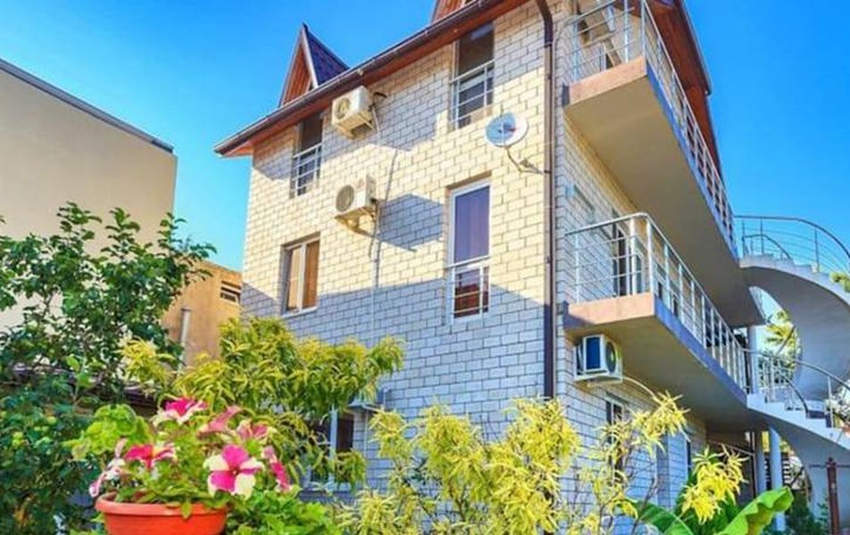 Трехэтажное кирпичное здание гостевого дома занимает небольшую, но уютную территорию. Вокруг много зелени, есть беседка для отдыха.