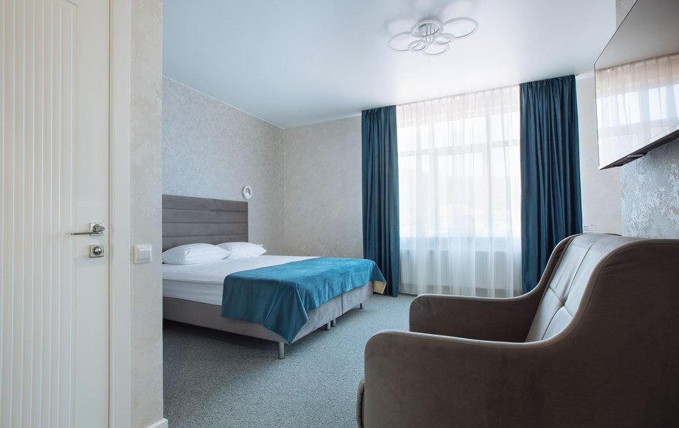 Современное четырехэтажное здание гостиницы занимает закрытую территорию. Жилой фонд включает в себя 23 номера. Двухместные номера с лаконичными приятными интерьерами, оснащены всем, что нужно для качественного отдыха. Везде имеется ванная комната с душем, и необходимыми косметическими принадлежностями, в номерах установлена сплит-система, благодаря чему в помещении всегда комфортная температура. Также в числе удобств – безлимитный интернет и телевизор.