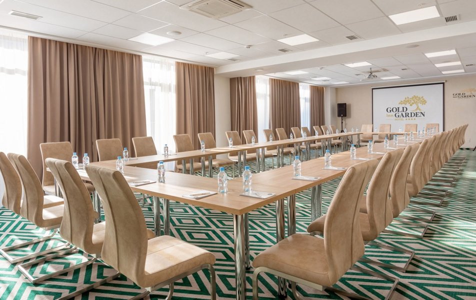 Отель предлагает 3 панорамных конференц-зала вместимостью до 120 гостей, которые прекрасно подойдут для любого формата деловых и праздничных мероприятий. Gold inn Garden - идеальное место для проведения свадьбы, организации банкета, фотосессии и проживания молодожёнов.