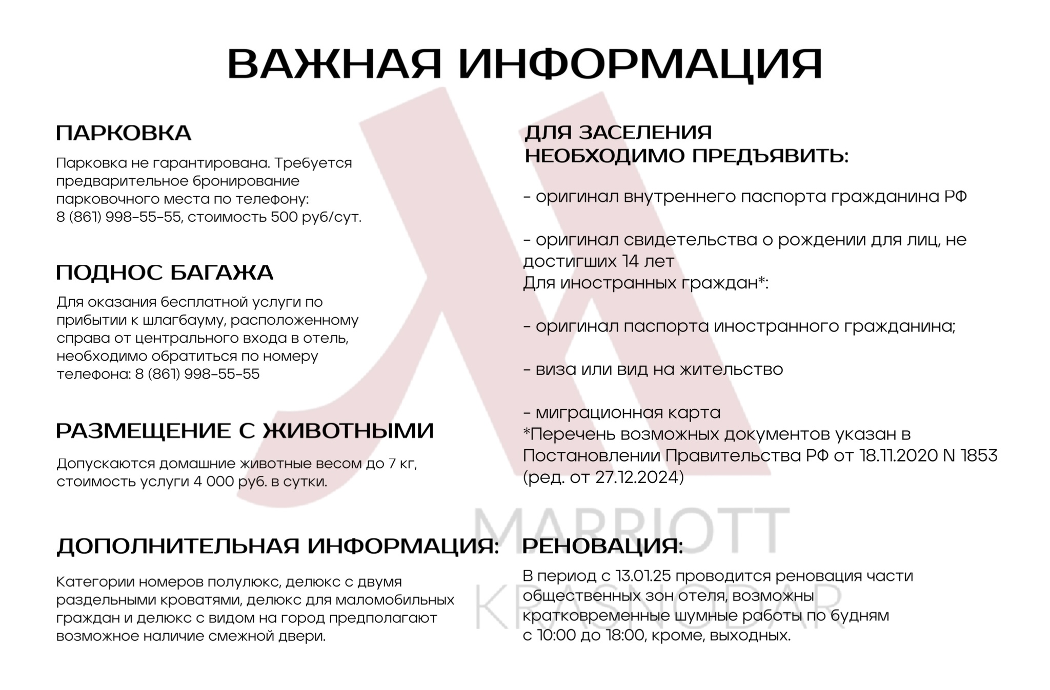 В отеле проводится реновация части общественных зон жилых этажей, возможны кратковременные шумные работы по будням с 10:00 до 18:00, кроме, выходных.