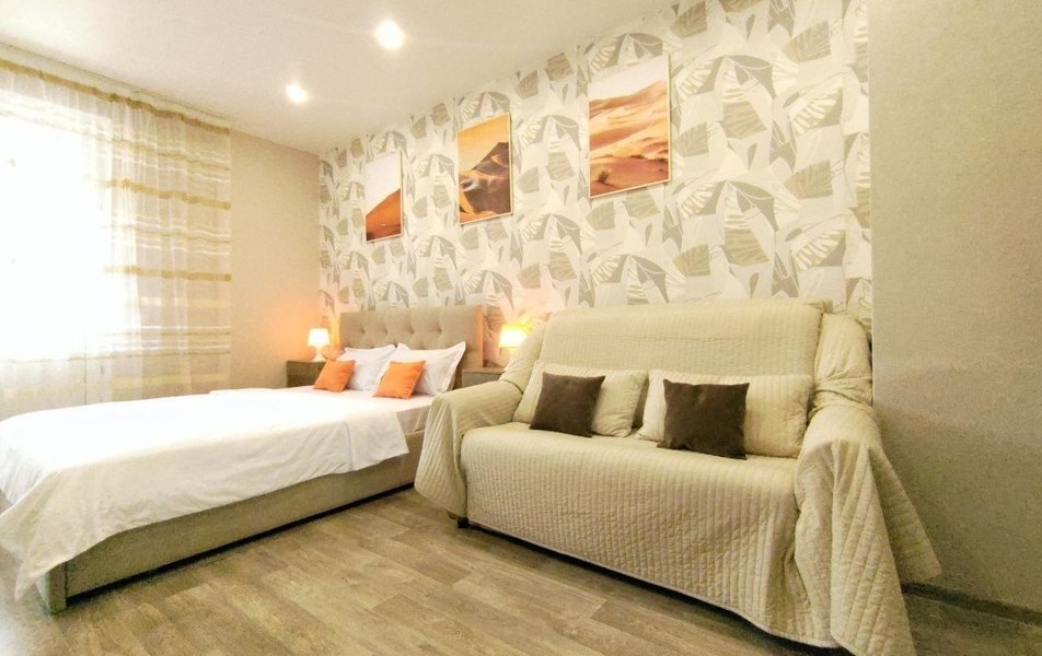 Внутреннее пространство рассчитано на размещение до четырех человек. Комфортабельная кровать 160х200 см заправлена чистым постельным бельем. Рядом с телевизором расположен раскладной диван для дополнительных гостей. В апартаментах есть телевизор с цифровым телевидением и скоростной беспроводной интернет. Имеется балкон с видом на прогулочную зону. Кухня оснащена всем необходимым для приготовления пищи — от чайной ложки до полного набора посуды и техники. В ванной комнате поддерживаются чистота и порядок, гостей ждут фен и набор гигиенических средств на выбор. Дополнительно можно заказать мини-бар с кофе, соками и другими напитками. Для маленьких путешественников предоставляется детская кроватка и горшок за отдельную плату.